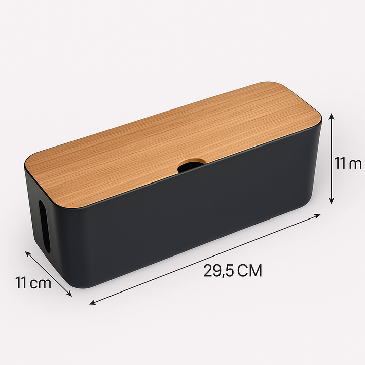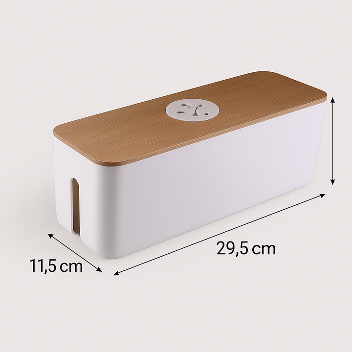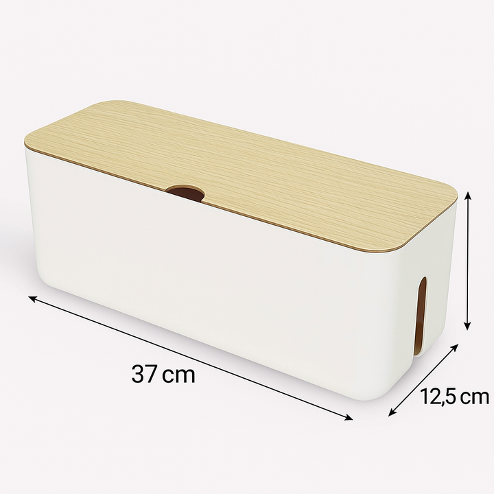 Opgrader dit hjem eller kontor med en moderne løsning til kabelhåndtering. Vores boks, fremstillet af hvid og sort plastik med elegant bambusfinish, organiserer og skjuler dine kabler stilfuldt. Designet til at forbedre æstetikken og sikkerheden i ethvert miljø, sikrer denne boks et ryddeligt og mere professionelt udseende.