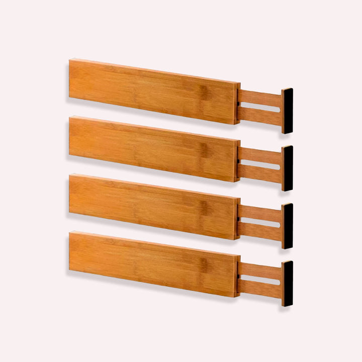 Opgrader din skuffeorganisation med et sæt på 4 stk stilrene og robuste skuffeopdelere, designet til at skabe overblik i køkken, kontor og soveværelse. Den justerbare konstruktion gør det nemt at tilpasse længden til forskellige skuffer, mens den matte overflade giver et moderne udtryk. Kvaliteten er gennemført med en kombination af træ og slidstærk plastik fra NordicLiving.