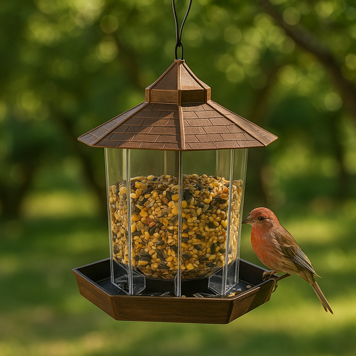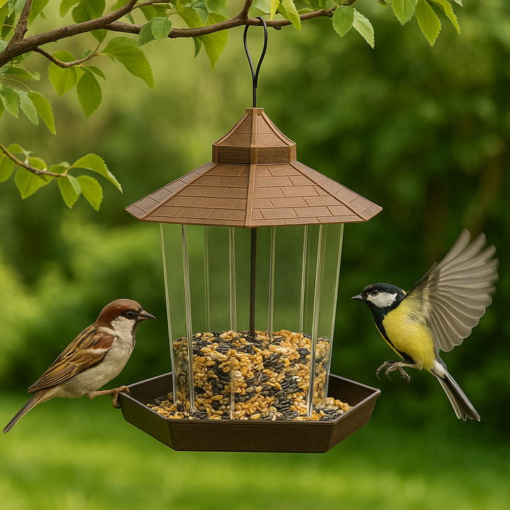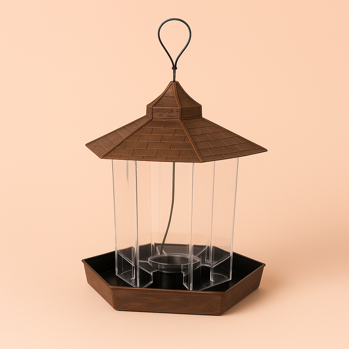 Foderautomat til Fugle i Holdbar Brun og Gennemsigtig Plast - Klassisk Design