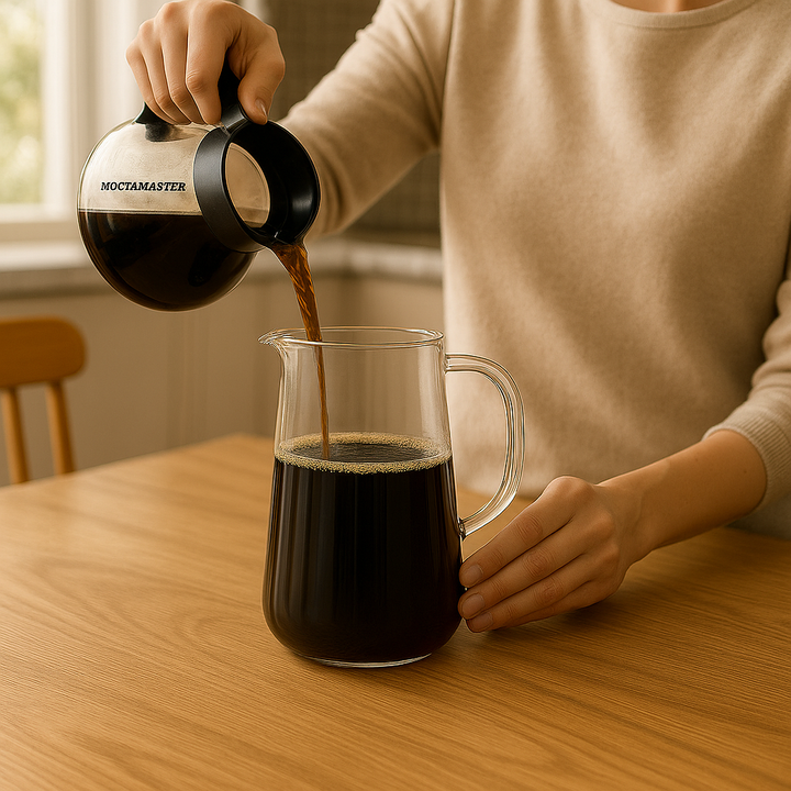 Velkommen til en verden af nordisk elegance med vores glaskande. Denne kande kombinerer klart glas med et træhåndtag og -låg, hvilket giver en naturlig og tidløs æstetik. Uanset om du serverer vand ved middagsbordet eller bruger den til at hælde friskbrygget kaffe fra en Moccamaster, vil denne kande imponere med sit design og funktionalitet. Det robuste glas og det charmerende trælåg gør den ideel til både daglig brug og særlige lejligheder.