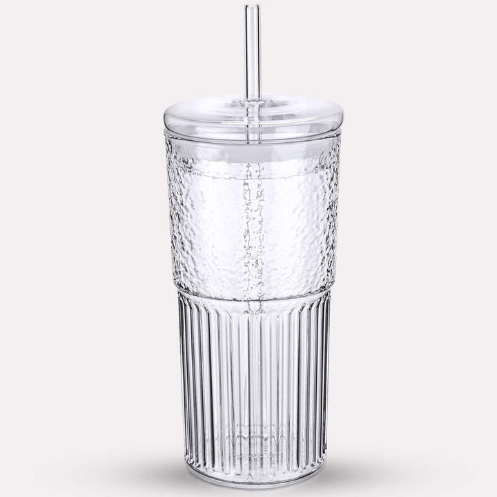 Oplev bekvemmeligheden ved vores moderne glaskop, som er perfekt til at nyde kolde drikke derhjemme, på kontoret eller på farten. Med sit elegante rillemønster sikrer den et godt greb, mens det klare, slagfaste borosilikatglas giver en stilfuld og holdbar løsning. Låg og sugerør i plast gør den ideel til udendørs aktiviteter, da de effektivt forhindrer spild.