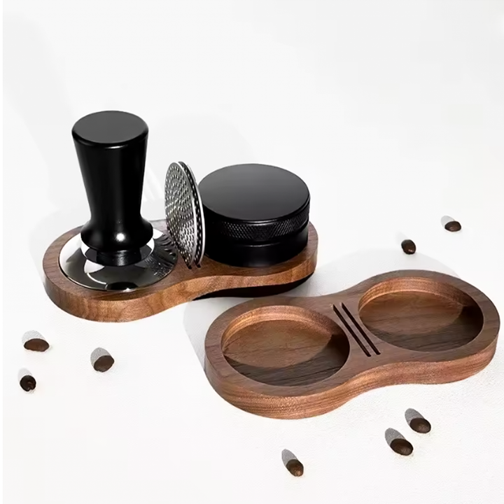 Oplev den perfekte kombination af funktionalitet og æstetik med vores holder til tampersæt fremstillet i valnøddetræ. Denne holder er designet til at organisere og præsentere dine kaffeværktøjer med stil. Valnøddetræets rige tekstur og naturlige skønhed supplerer en moderne indretning, mens den samtidig gør det nemt at holde orden på dit kaffetilbehør, fra opvaskebørsten til krydsord og meget mere.