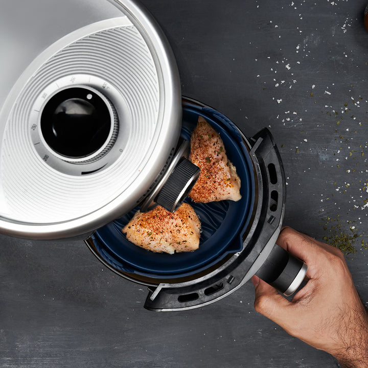 Ideel til daglig madlavning, denne silikoneform passer perfekt ind i mindre køkkener med dens pladsbesparende design. Brug den til at tilberede alt fra sprøde grøntsager til saftig kylling i din airfryer.